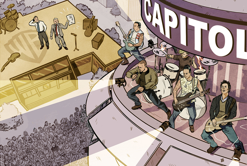Story about the label change from the popular metal band, formerly tied to Warner Bros, who also announced their new work in a surprise concert on top of the Capitol Records Building. Art Directed by Chris Elsemore.